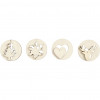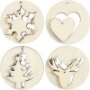 Assortiment de 4 designs différents de décorations 2-en-1, chacune a la forme d'un disque en bois clair, avec une forme de Noël qui peut être retirée de l'intérieur du disque. Le disque comme la forme ont un trou pour monter un cordon.
