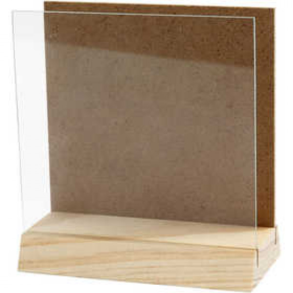 Planchette MDF avec vitre et piétement en bois clair. Adapté aux techniques en 3D avec avant et arrière plan.