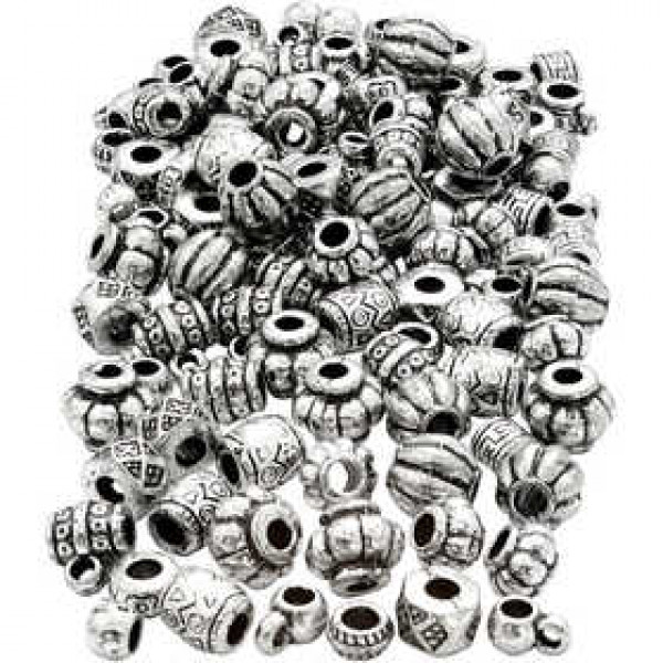 Perles en plastique multi usages à surface gravée - look métallique - certaines sont munies d'un anneau de suspension.