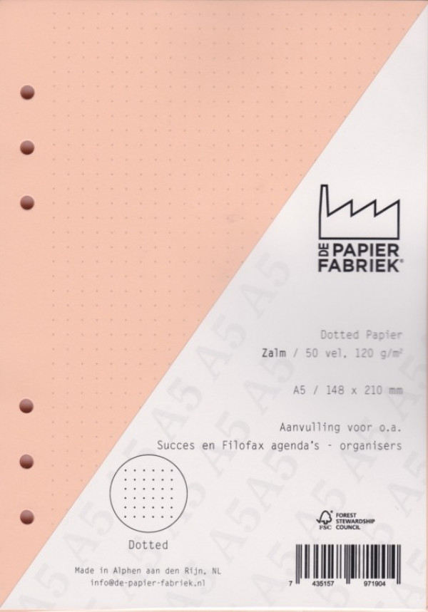 A5 Filling notes paper for example for: Succes, Filofax and Kalpa Calendars/Planners - A5 Size - 50 sheets (100 pages) - Dotted Salmon coloured Paper - 120 g/m2. Price is per 50 sheets