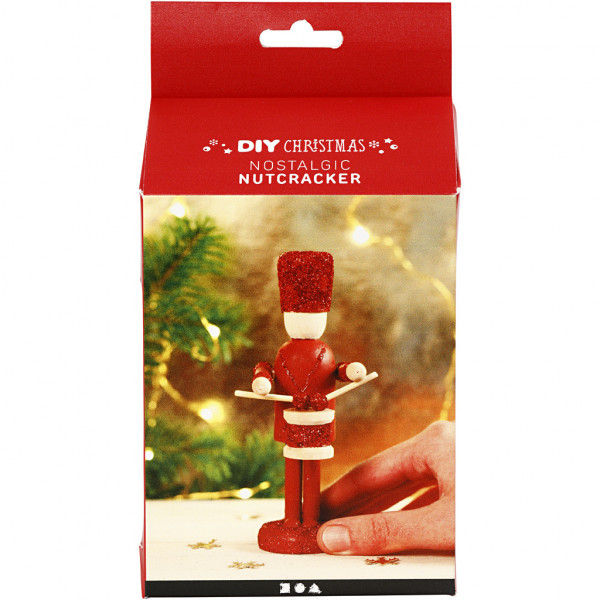 Kit de matériel pour un casse-noisette, composé d'une figurine et d'un tambour en bois, de peinture, pinceau, colle et paillettes.