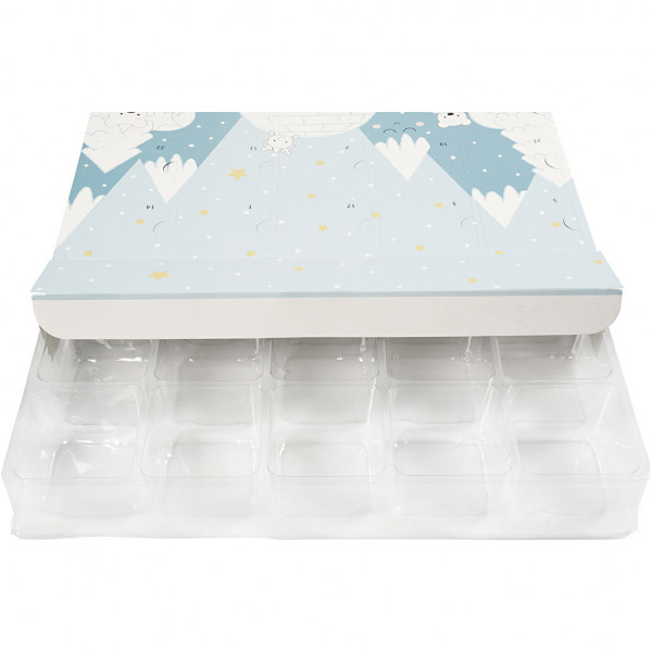 Avec plateau en plastique intérieur amovible fait de compartiments pour 24 petits cadeaux. Choisissez le contenu à placer derrière les portes imprimées.