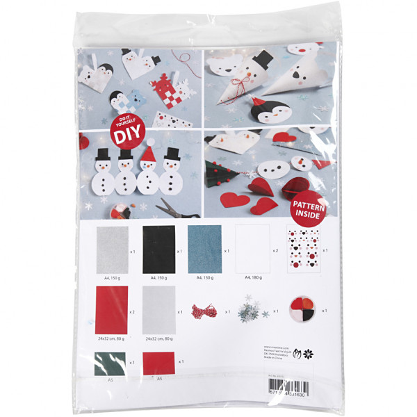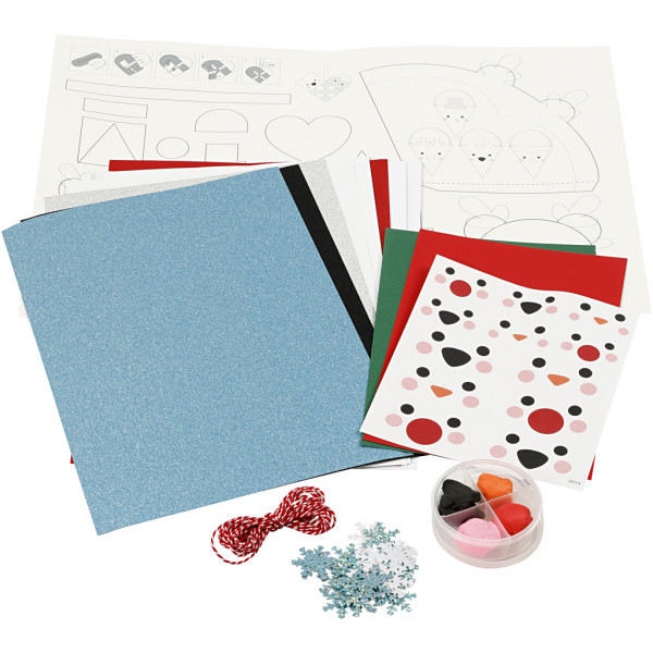 Contents: Three colours of glitter paper, red and white cotton string for suspension, Silk Clay and cardboard in different colours, white and red glossy paper, stickers with eyes and noses, and 10g sequins.