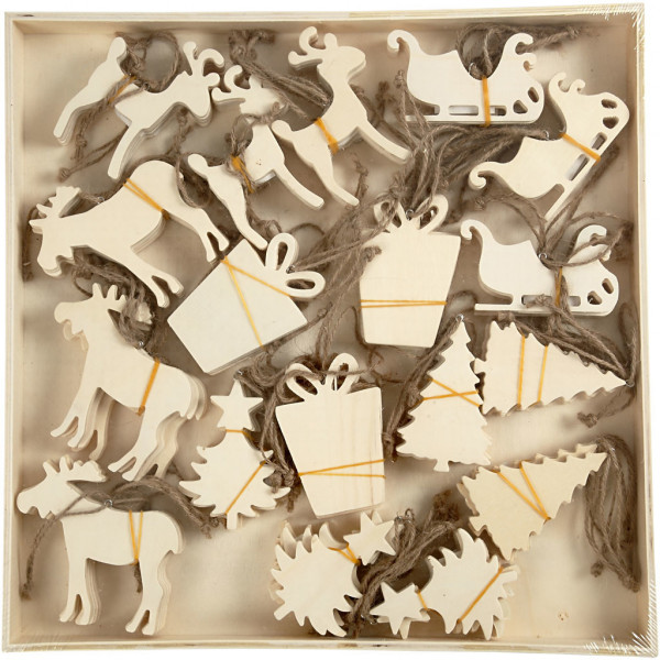 Ornements en bois clair avec 6 designs différents.
