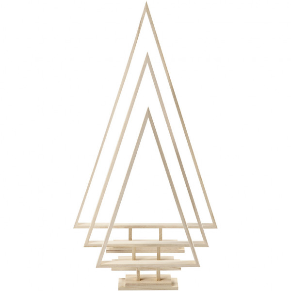 Sapins de Noël en bois clair présentés sous forme de contour sur un pied stable.