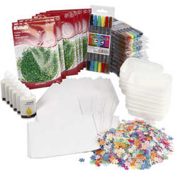 Contenu : 24 pièces de plateaux de cresson, 8 sachets de graines de cresson, 12 paquets de marqueurs Colortime, des paillettes fleurs et 6 pièces de la colle Clear Multi Glue Gel.
