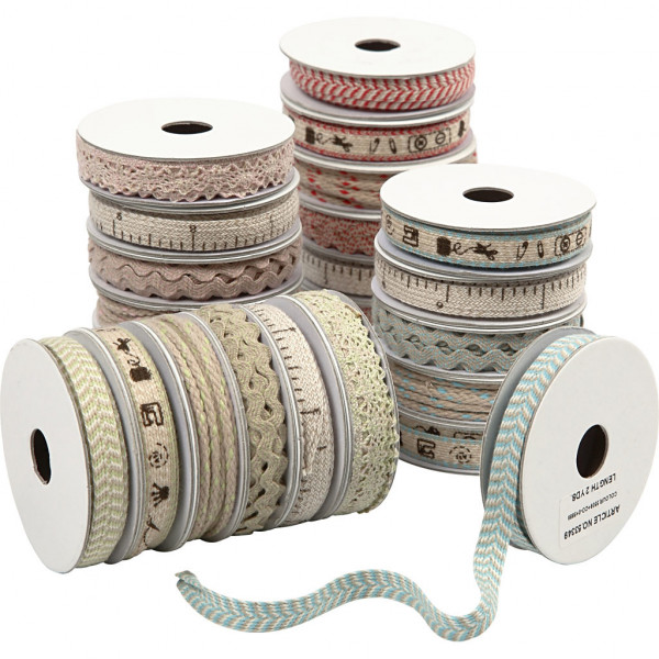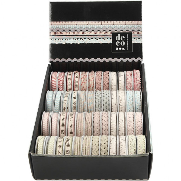 Rubans décoratifs, l: 3-10 mm, rouge, bleu clair, vert clair, rouge clair, 48x1,8m [HOB-41054]