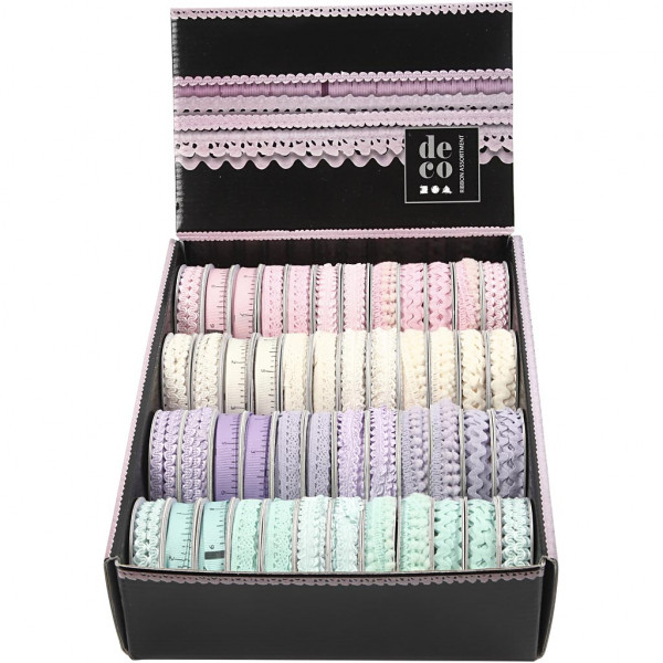 Rubans décoratifs, l: 6-10 mm, couleurs pastel, rouge clair, écru, violet, vert, 48x1,8m [HOB-41056]