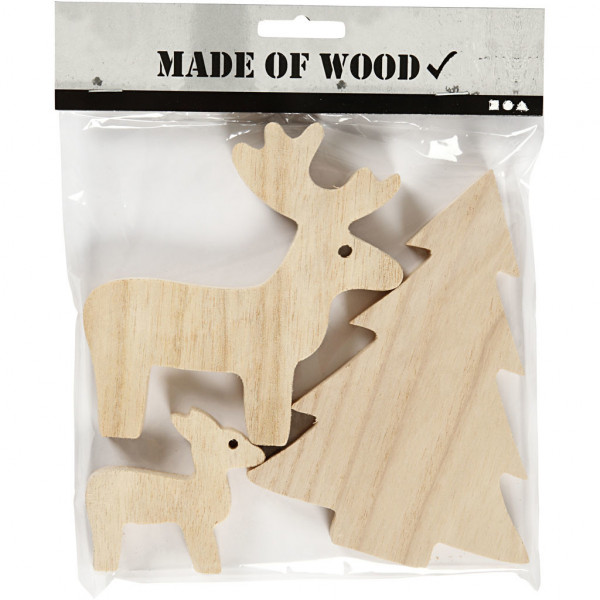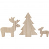 Faon, cerf et sapin de Noël taillés en bois. Les figurines ont une face antérieure et une face postérieure plates et peuvent tenir debout.