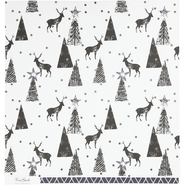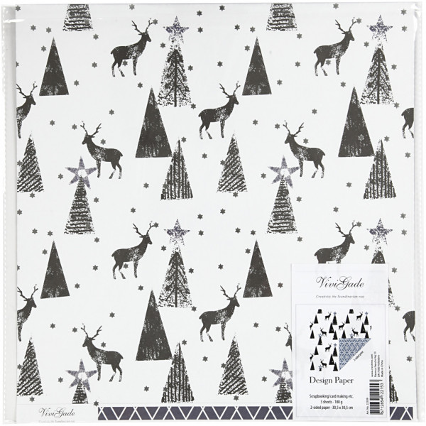 Papier Design, feuille 30,5x30,5 cm, 180 gr, blanc, argent, noir, rennes et motifs, 3flles [HOB-22509]