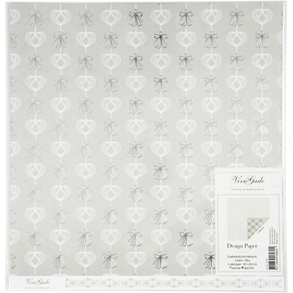 Papier design, feuille 30,5x30,5 cm, 180 gr, argent, anges et coeurs, 3flles [HOB-25345]