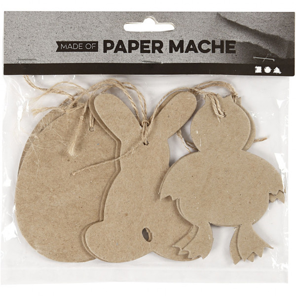 Décorations de Pâques plattes, fait main, en papier mâché avec ficelle en jute.