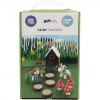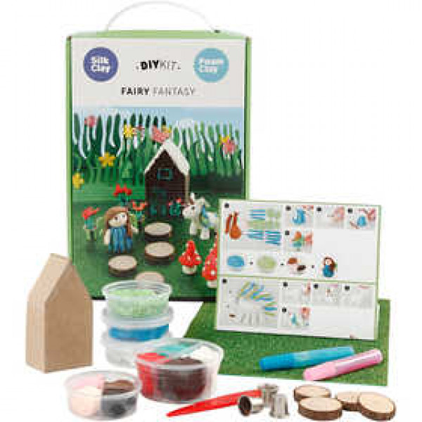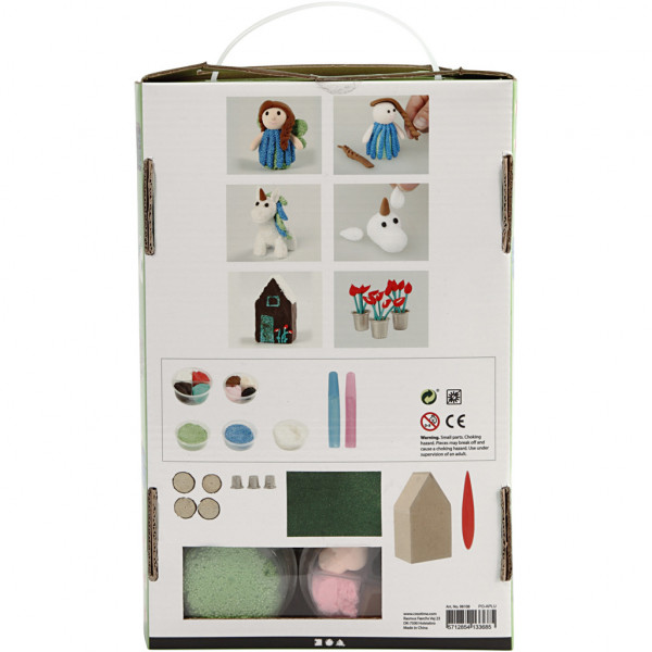 Contenu: Pâtes Foam Clay et Siulk Clay en plusieurs couleurs pour confectionner une fée, une licorne, un crapaud. Colle pailletée, petits disques en bois, mousse à paillettes pour le 'sol de la forêt', dés à coudre comme pots. maison en papier mâch.