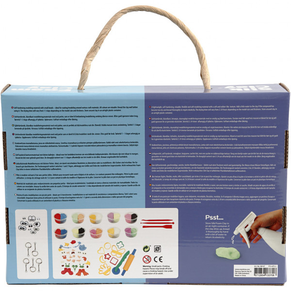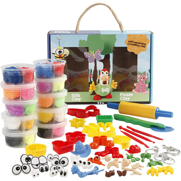 Contenu: Foam Clay en 10 couleurs, Silk Clay en 10 couleurs, 5 outils manuels, 8 moules, 9 paires d'yeux, assortiment de parties du corps et 5 orte-clés pour y accrocher les créations.