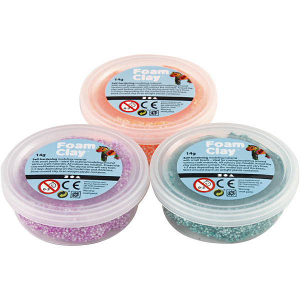 Assortiment de pâte à modeler autodurcissante dont la structure contient une multitude de petite billes - idéal pour recouvrir/ modeler des matériaux. Emballée dans des boîte pratiques.