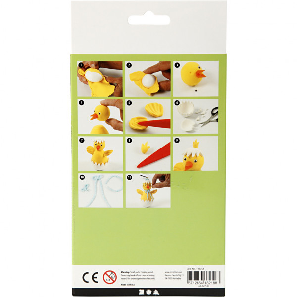 Contenu : 2 couleurs différentes de Silk Clay, 1 couleur de Foam Clay paillettée et 2 boules en polystyrène, un bec, 2 yeux et une paire de lunette.