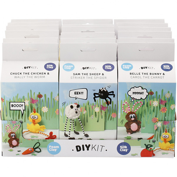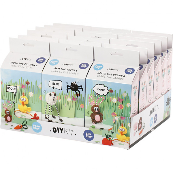 Un assortiment de boîtes avec tout le matériel nécessaire pour réaliser un lapin, une poule ou un mouton. Disponible en affichage de table pratique et attrayant.