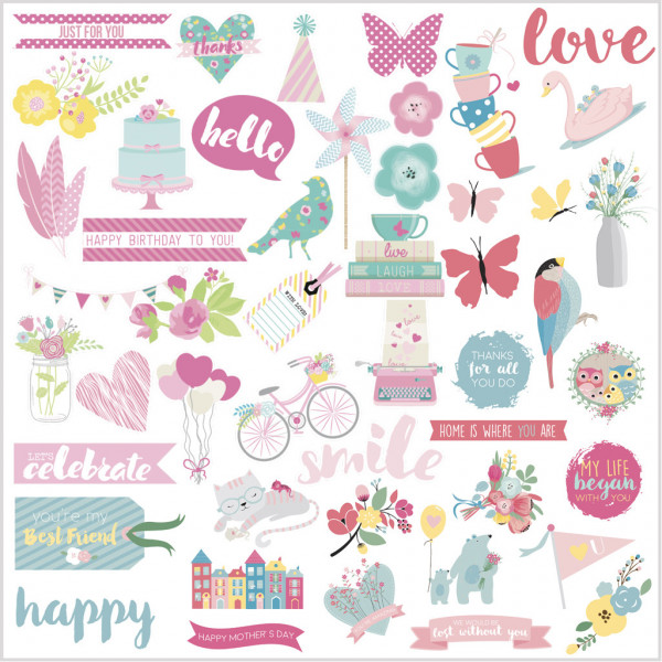 Petits motifs de tailles différentes en papier cartonné poinçonné. Tous imprimés couleur, et beaucoup d'entre eux avec du film doré. Peuvent, par exemple, être utilisés pour la décoration et le scropbooking.