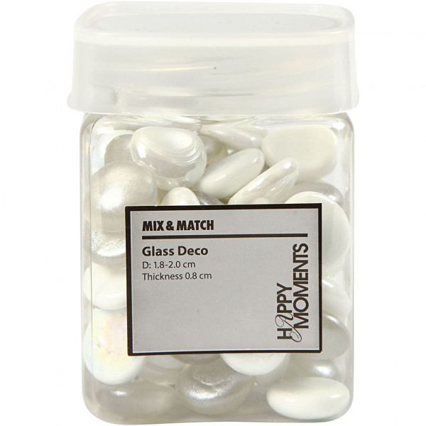 Mosaïques rondes et plates en verre avec surface mate et brillante de deux tons différents. Peut par exemple être décoré avec des marqueurs pour verre et porcelaine.