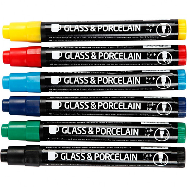 Feutres pour verre et porcelaine, largeur de trait: 1-3 mm, couleurs classiques, Semi opaque, 6pièces [HOB-31651]