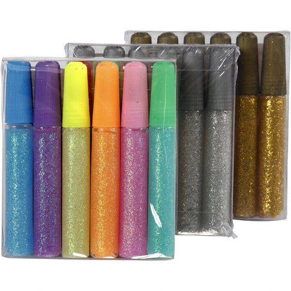 Assortiment de colle pailletée de bonne qualité dans un tube en plastique avec pointe.
