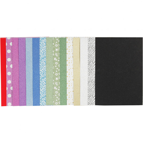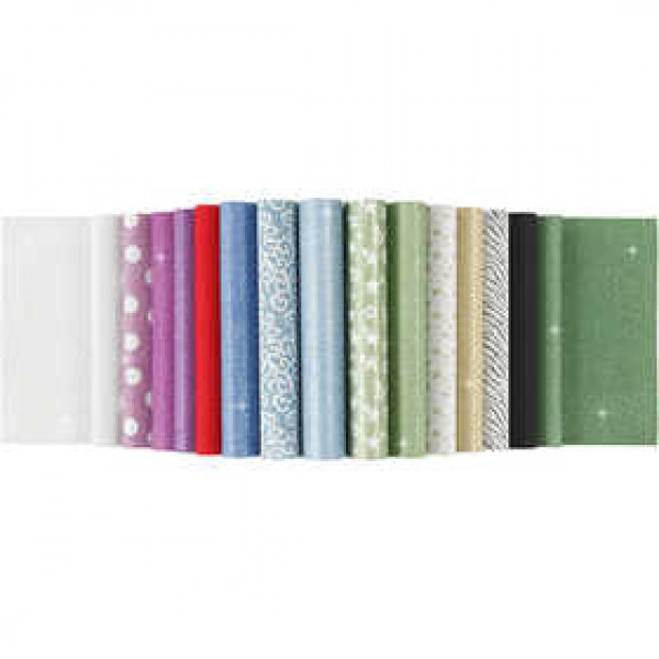 Gamme de papiers mats imprimé avec laque pailletée sur une des deux faces. Un total de 10 feuilles de couleurs unies et 5 feuilles à motifs, 2 de chaque.