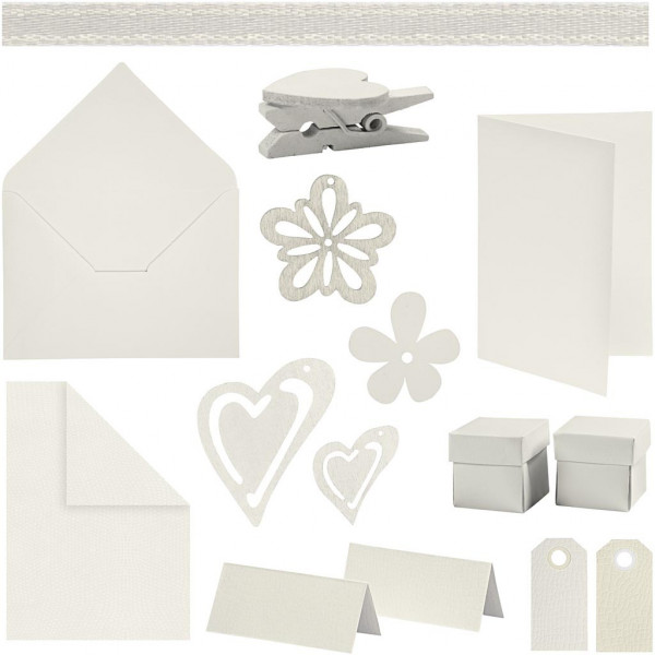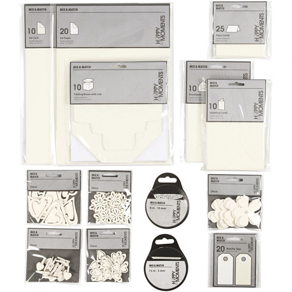 Contenu: cartes, enveloppes, marque-places et étiquettes manilla - 15 paquets de papier, cartes, boîtes pliantes - 10 paquets de ruban décoratif en satin, 20 rouleaux assortis, 6 décorations en bois de 6 designs différents de 10 paquets chaque.