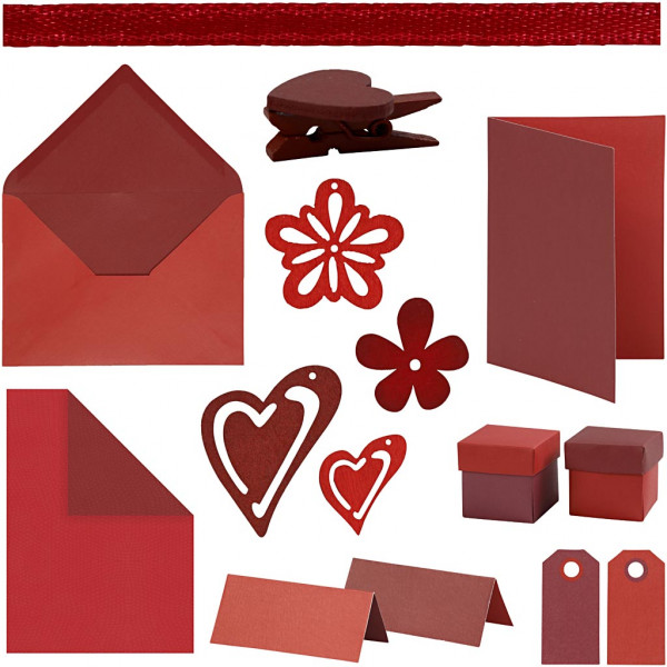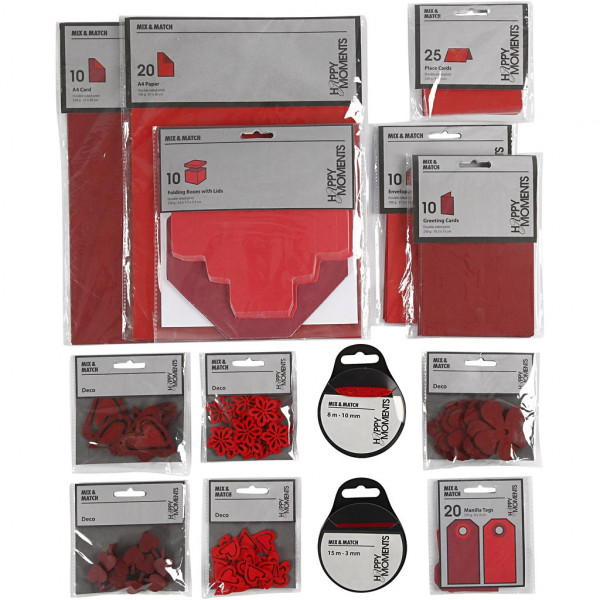 Contenu: cartes, enveloppes, marque-places et étiquettes manilla - 15 paquets de papier, cartes, boîtes pliantes - 10 paquets de ruban décoratif en satin, 20 rouleaux assortis, 6 décorations en bois de 6 designs différents de 10 paquets chaque.