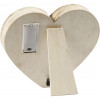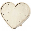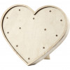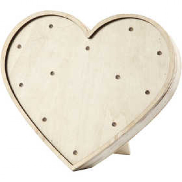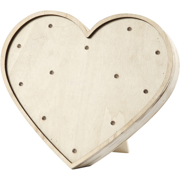 Coeur fait en bois clair, avec 12 petites ampoules intégrées sur la face antérieure, produisant une lumière dorée. Est monté avec un pied de support à l'arrière.