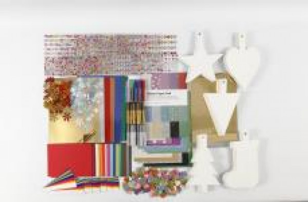 Contenu: 120 feuilles de papier caartonné, 30 feuilles de papier métallisé et 24 colles pailletées de différentes couleurs, 20 feuilles de papier doré et argenté, 100 cartes de Noël blanches, des pierres de strass autocollantes, 400 bandes de papier,.
