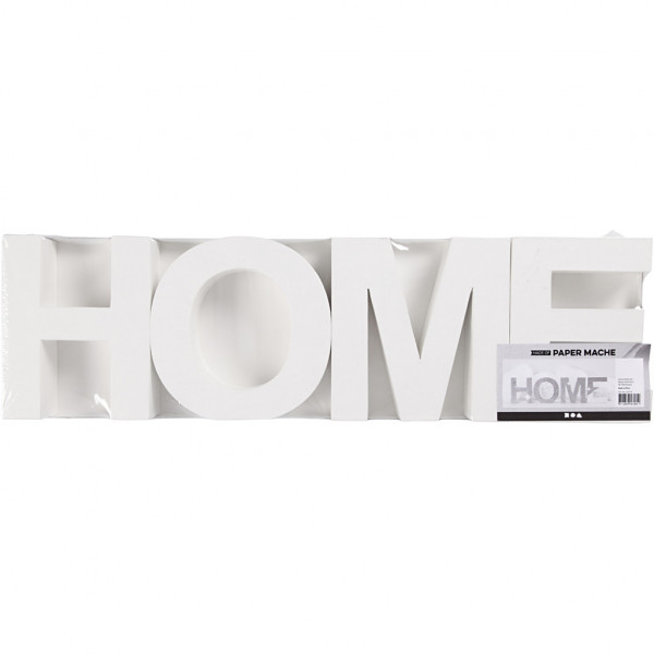 Mot 'HOME' à afficher, fait de lettres modelées dans du carton blanc.