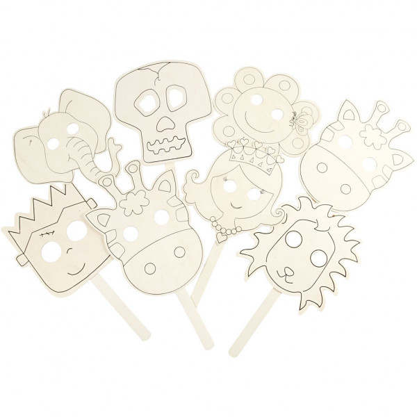 Masques en bois avec trous, poignée et décoration. Paquet de 8 designs différents avec 2 de chaque.