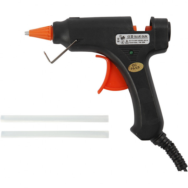 Minii pistolet à colle - fait fondre la colle à 170°C (haute température) - fonctionne avec bâtons de colle de7 mm de diam. - livré avec deux bâtons de colle de 10 cm et une prise standard CEE7.