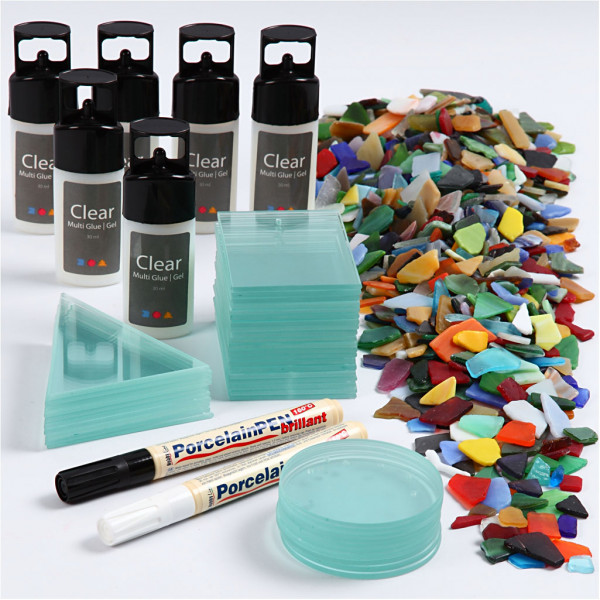 Contenu: 40 plaques en verre assorties, 2 kg de mosaïques en verre, 6x30 ml de colle Clear Multiglue, marqueur pour verre et porcelaine noir et blanc.