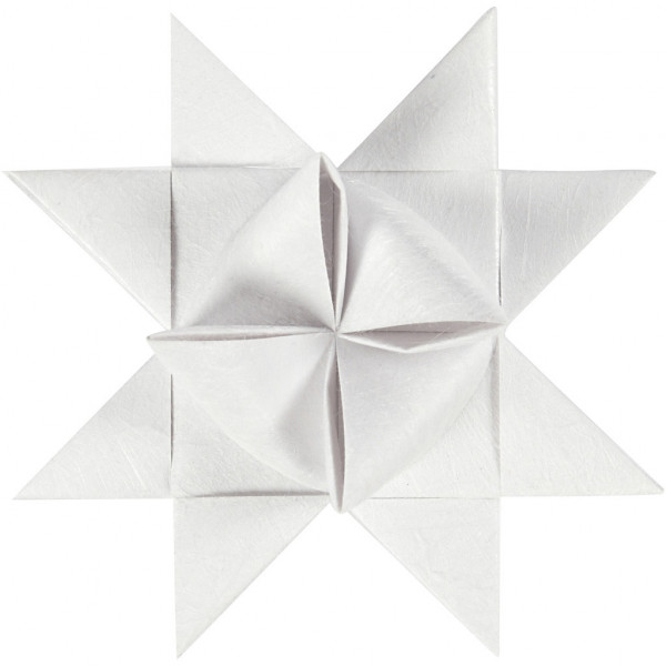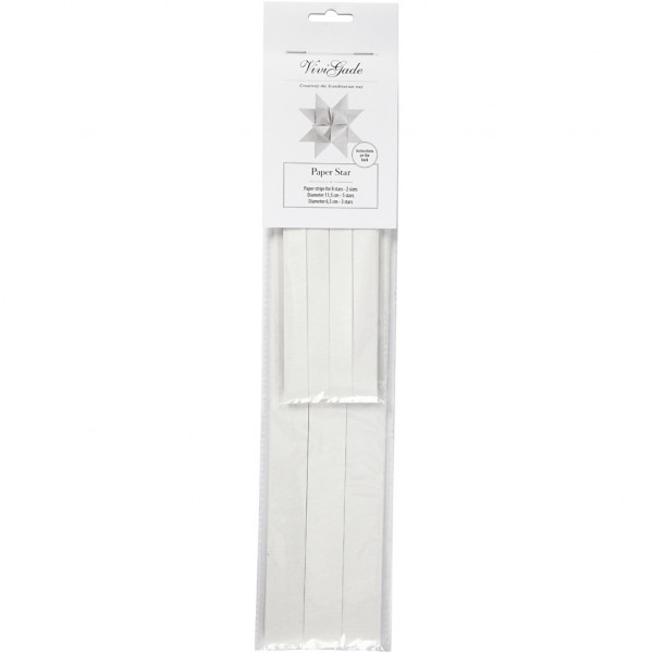 Bandes de papier pour le tressage d'étoiles de deux tailles de chez Vivi Gade. Le papier est recouvert de fil de soie fin sur chaque face. Le diam. indique la taille de l'étoile terminée. Instructions incluses.