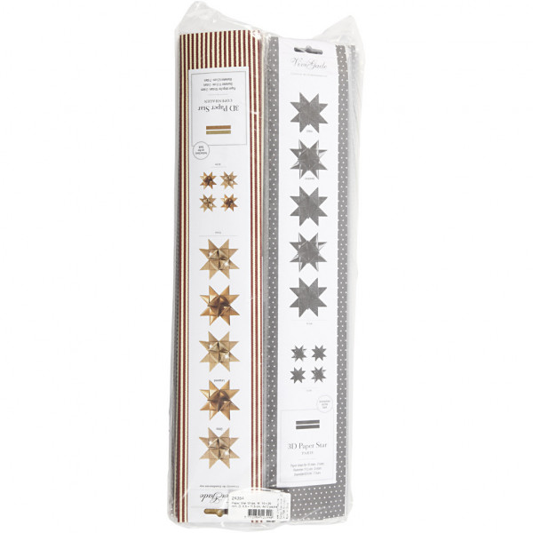 Assortiment de bandes de papier multicolores de deux tailles au design Vivi Gaden pour un total de quatre couleurs différentes avec laque et paillettes imprimées sur deux faces. Le diamètre indique la taille de l'étoile terminée. Avec instructions.
