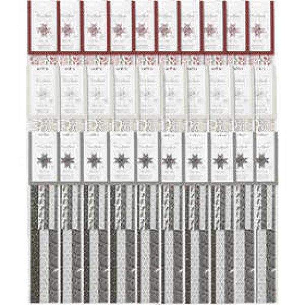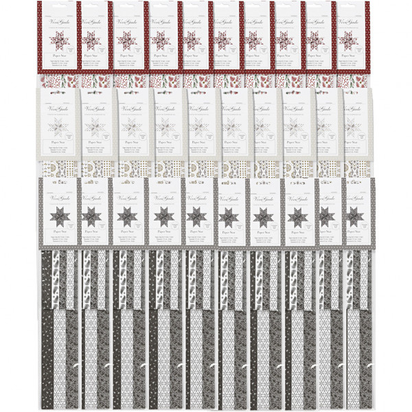 Ass. de bandes de papier vélin pour étoiles tressées en 2 formats. Les bandes sont imprimées d'un côté avec du film métallique de Vivi Gade. Le diam. indique le format final de l'étoile. Inst. incl.