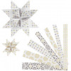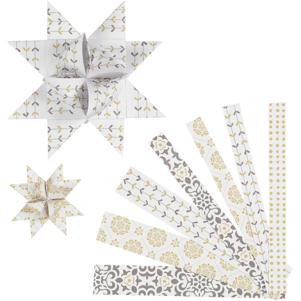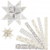 Assortiment de bandes de papier étoiles de deux tailles au design Vivi Gade pour un total de quatre étoiles différentes avec impressions sur 2 faces et de fins détails métallisés. Le diamètre indique la taille l'étoile terminée. Avec instructions.