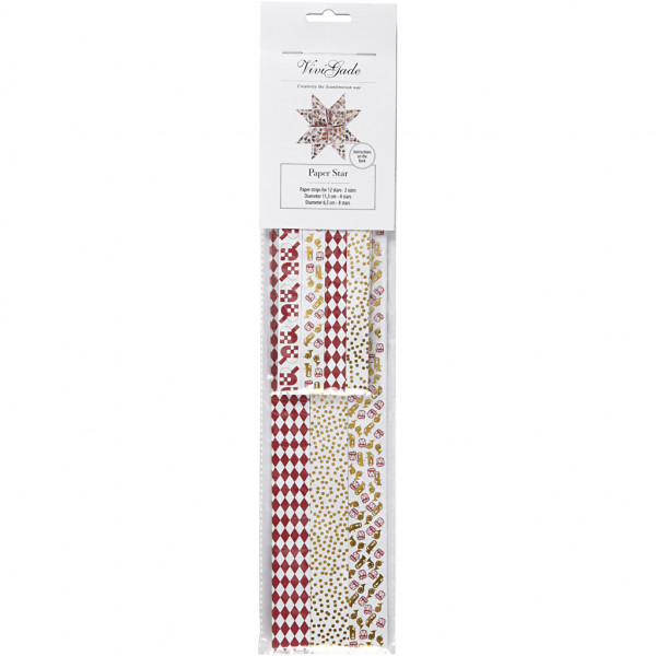 Bandes de papier pour le tressage d'étoiles aux motifs de chez Vivi Gade. Un total de 4 bandes différentes, imprimées sur deux faces et décorées de fins détails en film métallisé. Le diam. indique la taille de l'étoile terminée. Instructions incluses.