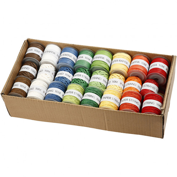 Ficelle de papier de qualité - boîte de présentation avec 3 sortes de ficelles de papier en 8 couleurs - 2 bobines de chaque.