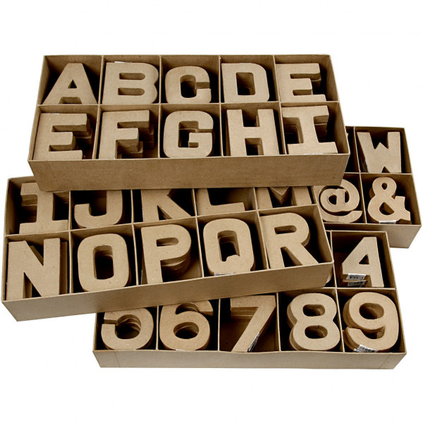 Boîte display Chiffres, Lettres et symboles en papier mâché, petit, h: 10 cm, épaisseur 1,7 cm, 160pièces [HOB-26667]