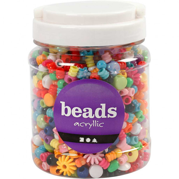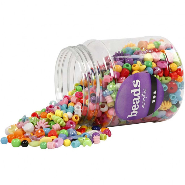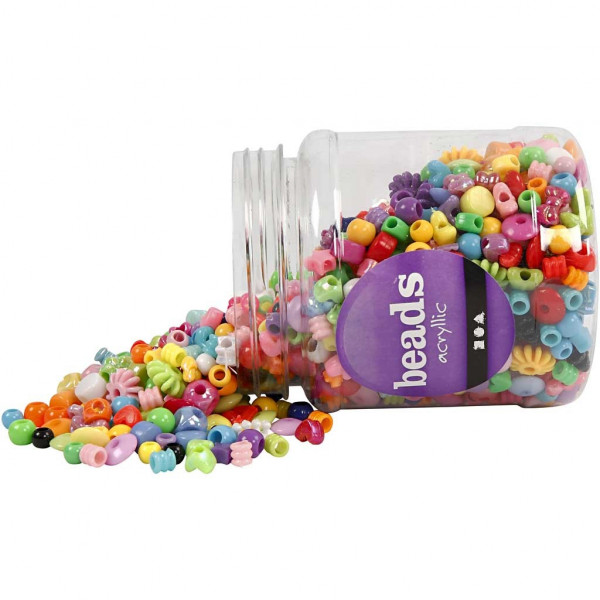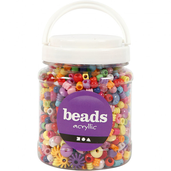 Fantastique assortiment de perles en plastique - nombreuses couleurs et formes - emballées dans un seau très pratique.
