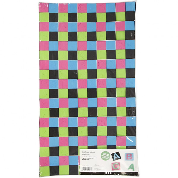 Chiffres & lettres en mousse EVA, dim. 30x30 mm, épaisseur 3 mm, turquoise, vert, rose, noir, 1800assortis [HOB-79007]