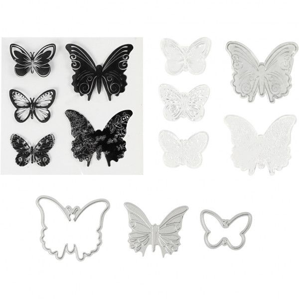 Contenu: 5 tampons, un modèle de gaufrage et 3 gabarits de coupe.