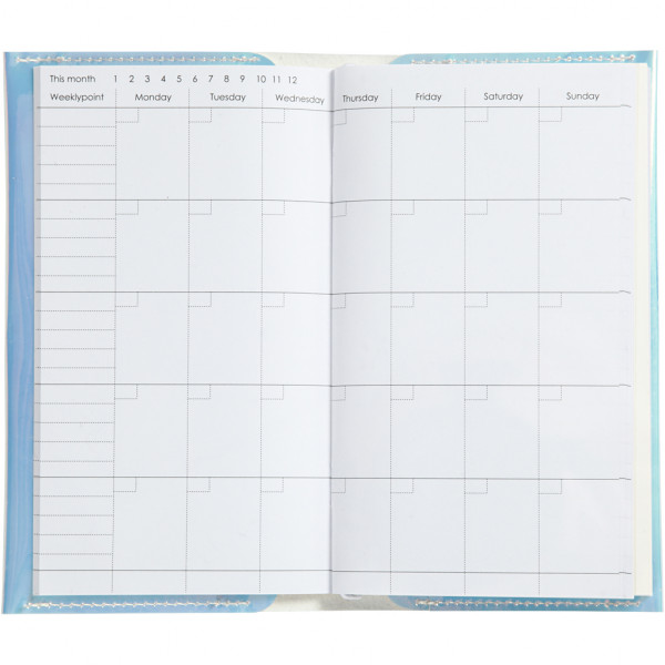 Contenu: livret agenda, calendrier hebdomadaire (34 pages), cahier à pointillés (32 pages). Le poids du papier est de 100 g/m2.