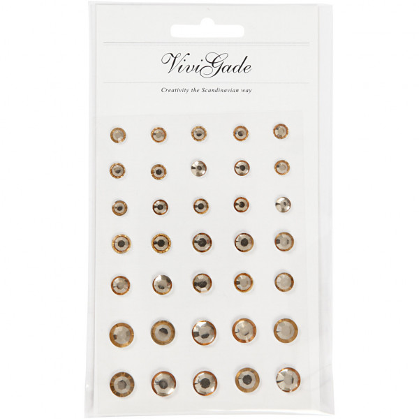 Pierres de strass autocollantes de chez Vivi Gade. Toutes ont une face antérieure en relief et un dos plat sur des feuilles avec 3 formats.