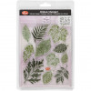 Feuilles de différents motifs de silicone transparent en relief autocollants. Montés sur un bloc transparent (article no. 24010 et 24009) et utilisés comme tampons.