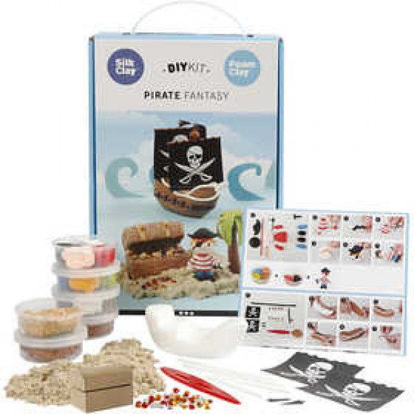 Contenu: Pâte Foam Clay et Silk Clay en plusieurs couleurs pour le bateau pirate, le palmier et le pirate. Coffre trésor en bois , pierres de strass pour créer un 'trésor secret' et du sable à modeler Sandy Clay pour confectionner 'l'île déserte'.