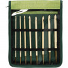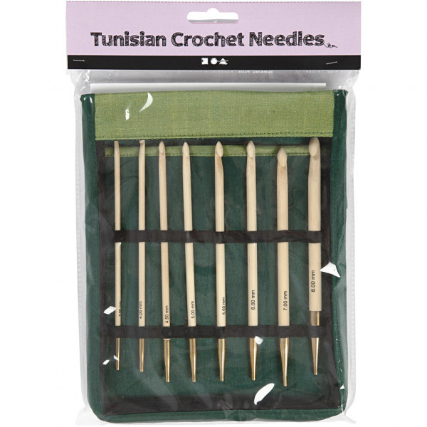 Set de crochets tunisiens en bambou lisse. Ce paquet permet de réaliser un grand projet au crochet tunisien. Livré dans une pochette verte avec rabat en plastique transparent.