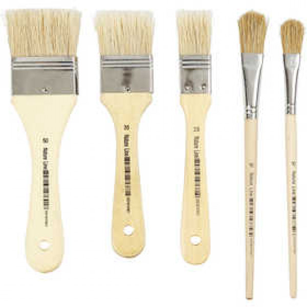 Assortiment d'excellents pinceaux plats pour vernis à poils de porc et manche court en bois. Set de 5 tailles, 2 pièces de chaque.